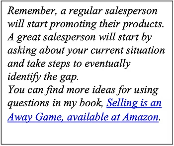 Again, you can see a variety in the forms of the sales questions. But the salesperson uses these questions to build credibility and trust to get the prospect to open up about their future goals, where they want to be. Your job, in your questioning process, is to create as clear a picture as possible of their future, desired situation that will give them what they really want.
